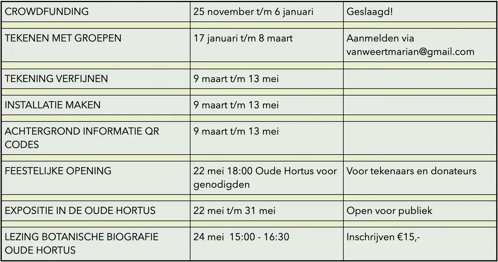 De crowdfunding is succesvol afgerond, en nu gaat het tekenen van start. Na de voltooiing van de tekening wordt de installatie gebouwd waarin de pentekening kan worden opgehangen. Op 22 mei wordt de Biografie feestelijk onthuld in de Oude Hortus van Utrecht, in het bijzijn van de tekenaars en donateurs die dit project mogelijk hebben gemaakt.