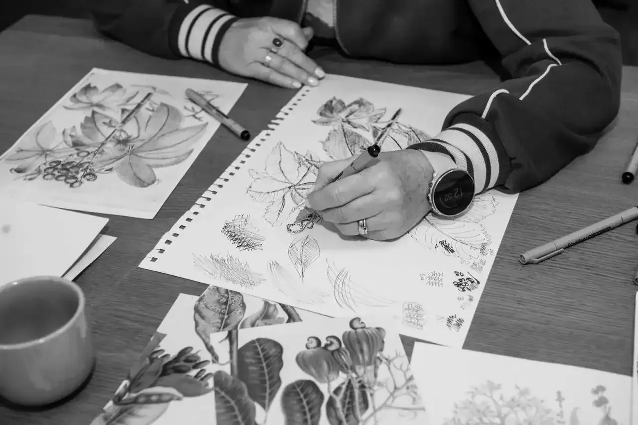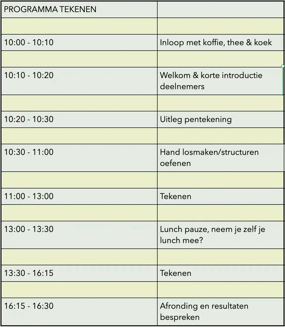 We beginnen de tekendag met koffie en thee en een korte voorstelronde. Vervolgens geef ik uitleg over de pentekening, waarna we een aantal tekenoefeningen doen om de handen los te maken. Daarna gaan we aan de slag met de eigenlijke tekening.